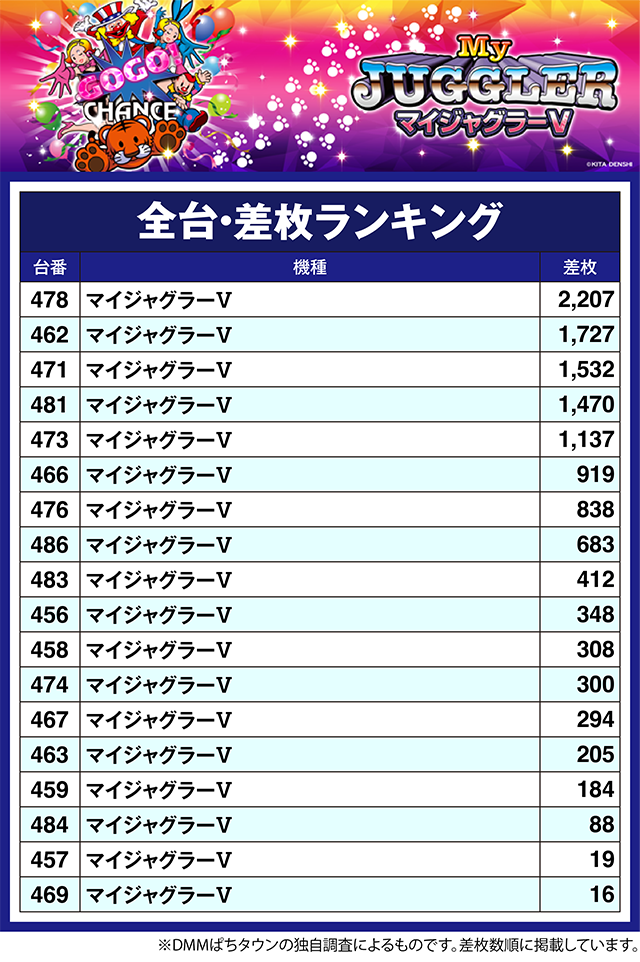 ボーナスタイプも活気は大きく、「ゴーゴージャグラー3」や「ファンキージャグラー2」などに2,000ptを超えた台があった。