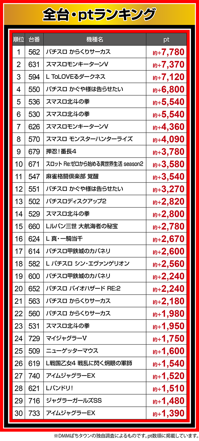 『スマスロ モンスターハンターライズ』の570番台も約+4,000ptオーバーと、多くの台が結果を残した。