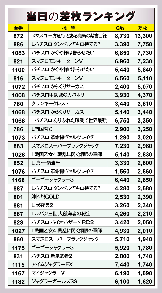 ※差枚数順に掲載しています。