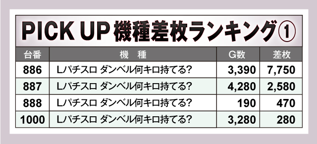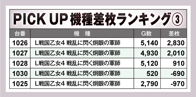 優秀台をピックアップして見ていこう。『Lパチスロ ダンベル何キロ持てる?』はしっかり回した3台中2台が結果を残している。『パチスロ からくりサーカス』はピーキーな機種の性質上、逆方向にハネてしまった台がいくつか見受けられた。『L戦国乙女4 戦乱に閃く炯眼の軍師』はG数多めの3台が、見事にプラス差枚を叩きだしている。やはり優秀台かどうかを推測しながら、長時間稼働するのが勝利への最短ルートだと物語っているようだ。