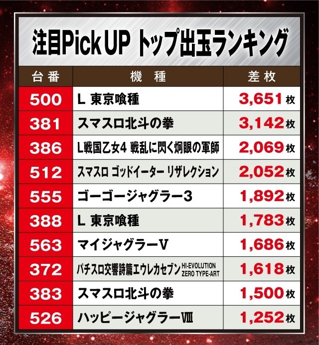 この日は、導入直後の最新台『L 東京喰種』が絶好調!! 500番台の+3,651枚を筆頭に3台中2台が好成績を残しランキング上位に登場、早くもそのポテンシャルの高さをファンにアピールし店内を盛り上げていた。