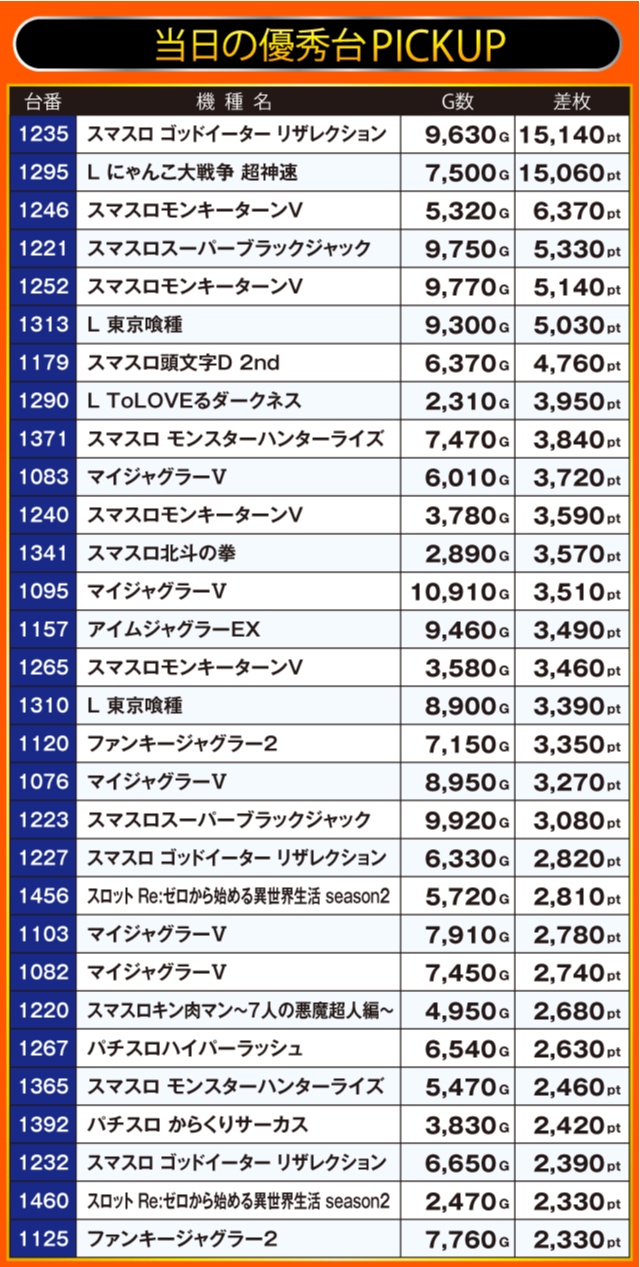 この日は、人気のスマスロを中心に+3,000pt超を記録する好調台が大量発生。そんな中、『スマスロ ゴッドイーター リザレクション』と『L にゃんこ大戦争 超神速』が圧巻の+15,000pt超を叩き出しプレイヤーの注目を集めていた。また、その他の機種で目立っていたのが『スマスロモンキーターンV』で、1246番台の+6,000pt超をはじめ複数の台が好成績を残している。