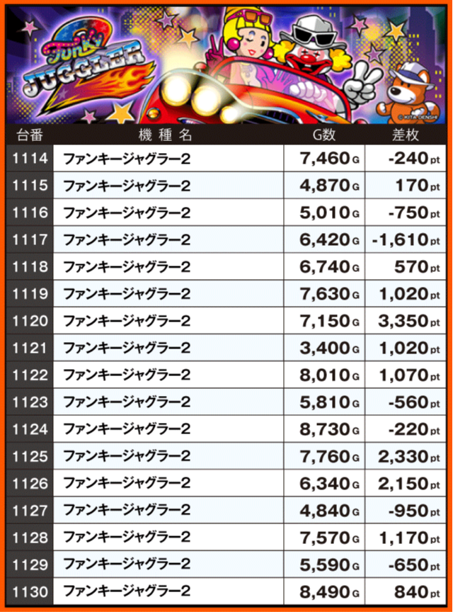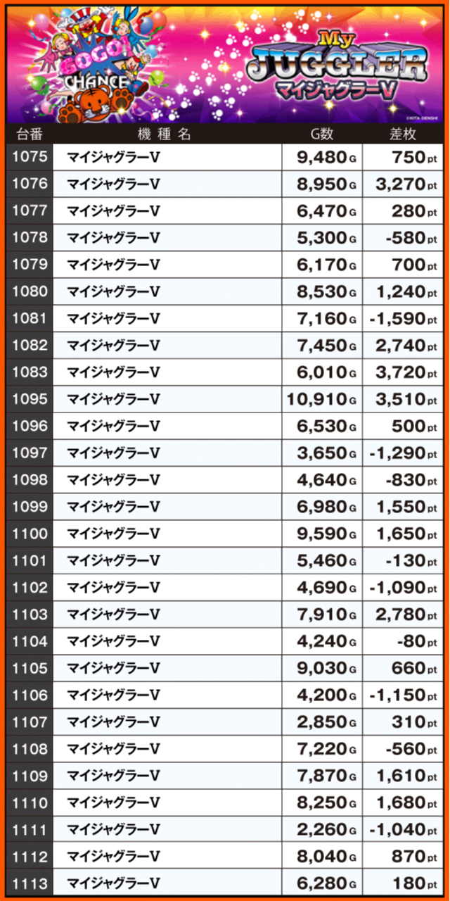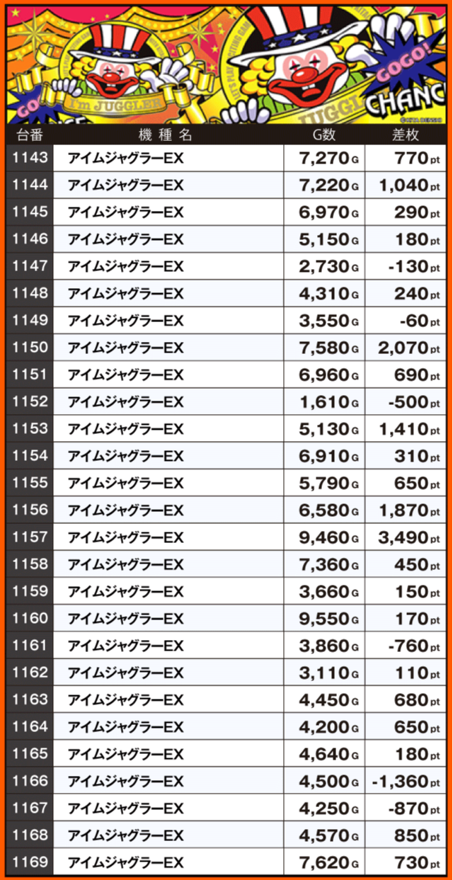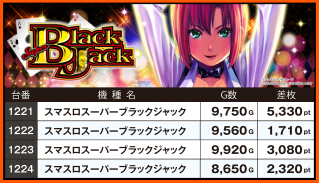 続いて注目機種の状況をチェックすると、同店の看板機種であるジャグラーシリーズが大奮闘。+2,000pt超が5台も確認されている『マイジャグラーⅤ』を筆頭に、3シリーズトータルの全72台中45台がプラス差枚となっている。そして、『スマスロスーパーブラックジャック』からは+5,000pt超が発生。ゲーム数も軒並み9,000G前後となっており、じっくり遊技を楽しむプレイヤーが多かったようだ。