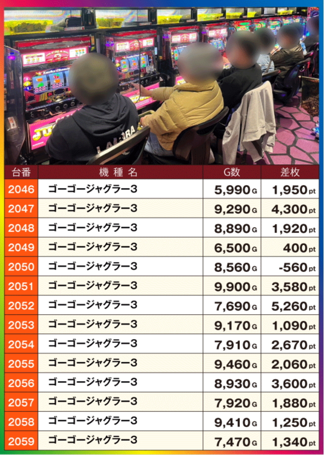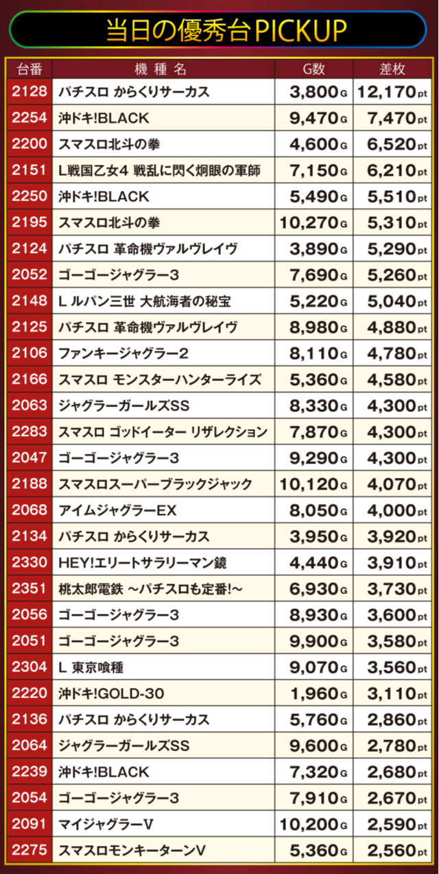 また、Aタイプながらジャグラーシリーズも大奮闘。『ゴーゴージャグラー3』の+5,000pt超を筆頭に、『ファンキージャグラー2』と『ジャグラーガールズSS』、さらには『アイムジャグラーEX』から+4,000pt超が発生しているだけに、ファンにとっては充実の一日となったはずだ。