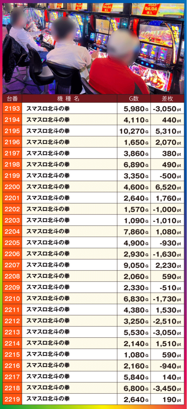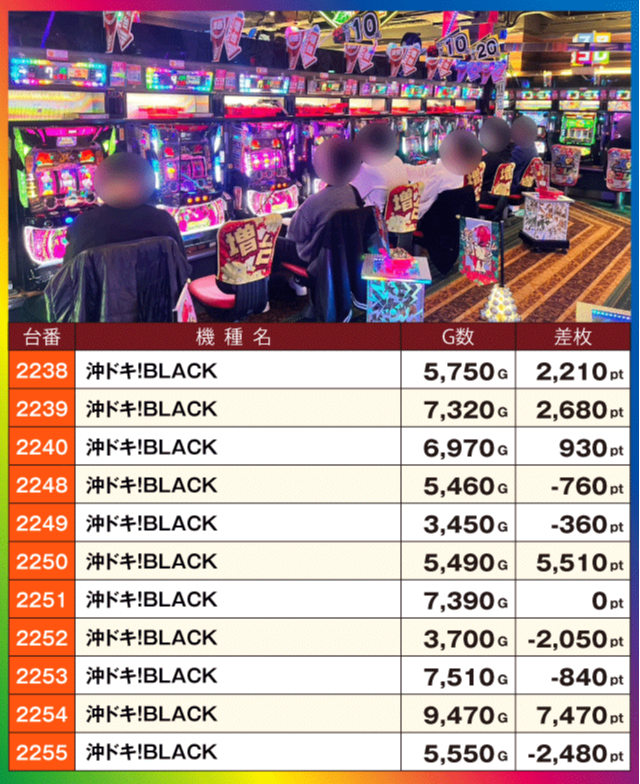 次に注目機種の状況をチェックすると、『ゴーゴージャグラー3』は全14台13台、『ジャグラーガールズSS』は5台全てがプラス差枚で終了する圧巻の結果を残した。また、『沖ドキ!BLACK』と『スマスロ北斗の拳』は、ランキング上位台以外にも+5,000ptが発生している。
