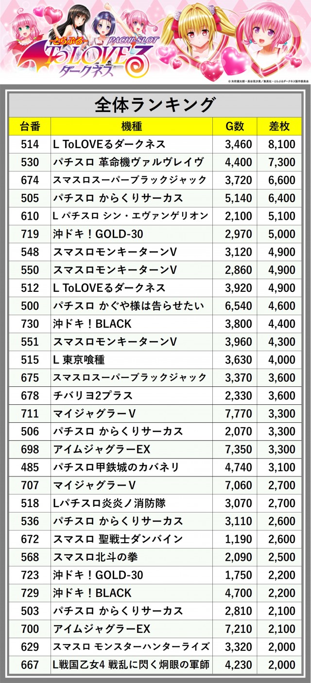 厳選された取材対象機種をはじめ、その他スロット全体から好記録が飛び出した!プレイヤーが楽しんだ1日を下記データにて振り返ってみて欲しい。