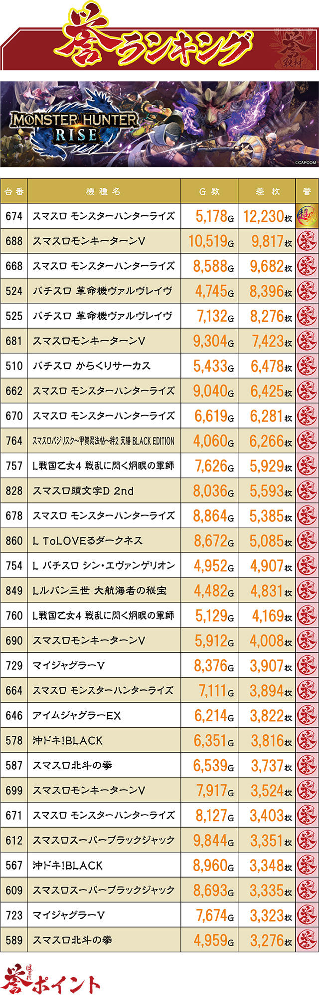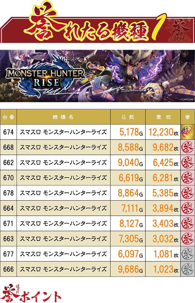 10日ぶりとなる誉取材で、最高差枚記録を叩き出したのは『スマスロ モンスターハンターライズ』。12,000枚を上回る破壊的なレコードだった。前回首位記録だった『スマスロモンキーターンV』は2位にランクイン。3位には再び『モンハン』が!なおこの日の『モンハン』は7台が誉ランキングに入賞を果たした。