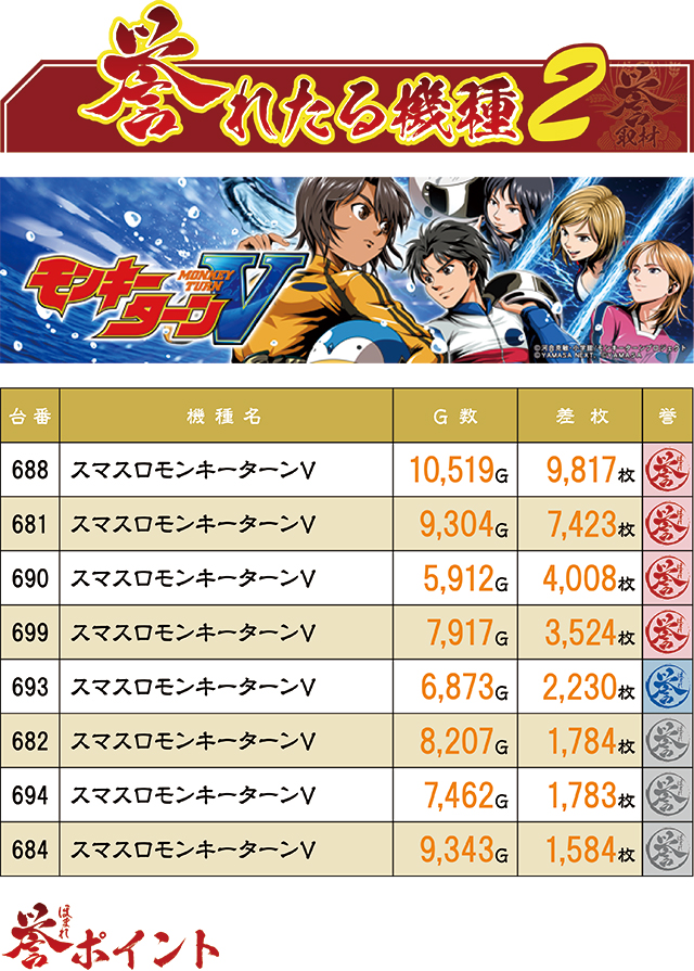 『スマスロモンキーターンV』からは8台の誉レコードが誕生。前回も好結果を多く生み出したことを鑑みるに、当面は『モンキー』狙いが吉なのかも…。