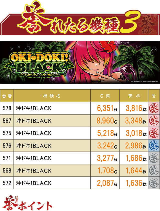 『沖ドキ!BLACK』からも見るからに好調な台が複数現れ、盛り上がりに拍車をかけていた。誉レコードは計7台で、いずれの台もハイビスカスランプは大忙しとなっており、沖ドキファンを十分満足させていた様子。