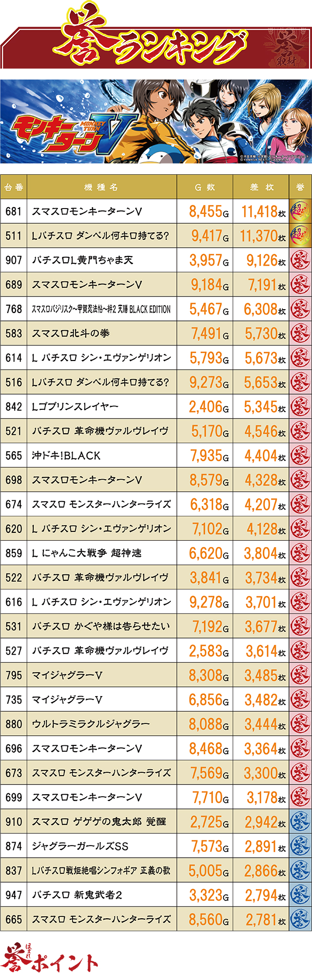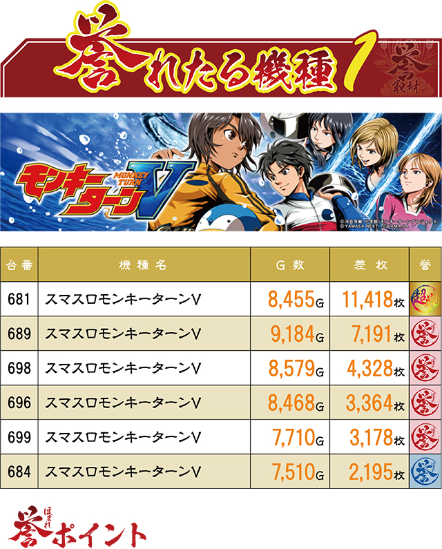 『スマスロモンキーターンV』からは、この日の最高差枚記録だけでなく、計6台もの誉レコード(=1,000枚以上)が誕生!それも6台中5台が赤誉マーク(=3,000枚以上)というのだから、その実力は健在だ。