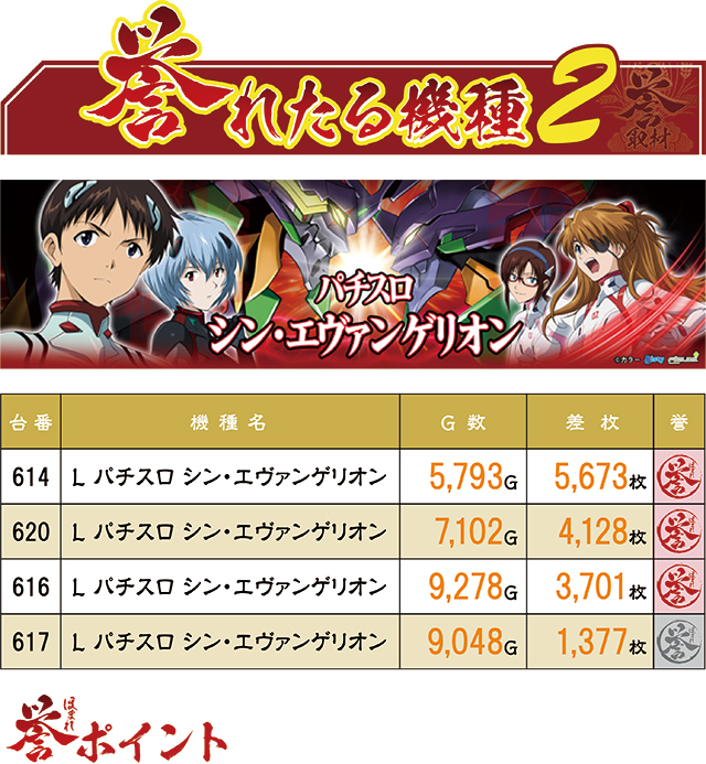 5台設置の『L パチスロ シン・エヴァンゲリオン』は、なんと4台が誉レコードという抜群の結果に。この結果を見るに、もしや5台ともが優秀台だった…!?