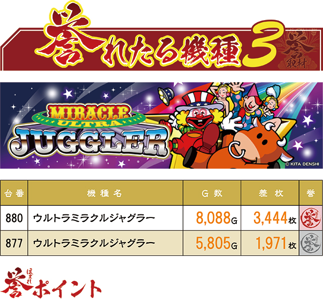 同じく5台設置の『ウルトラミラクルジャグラー』からは、2台の誉レコードが出現した。特に880番台が快調にGOGOランプをペカらせ、終わってみれば余裕の3,000枚オーバー!