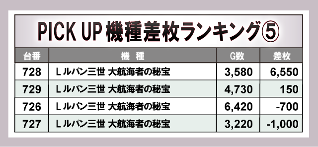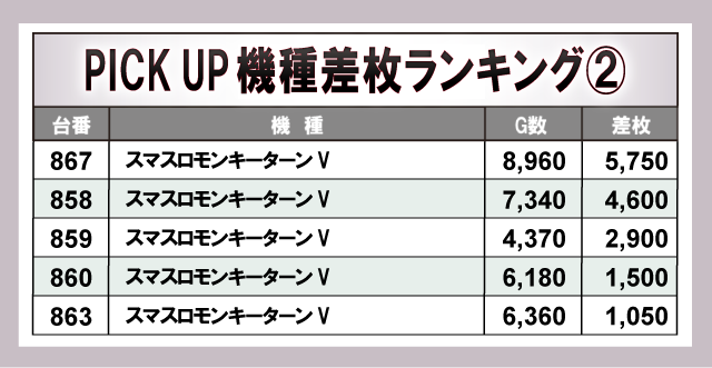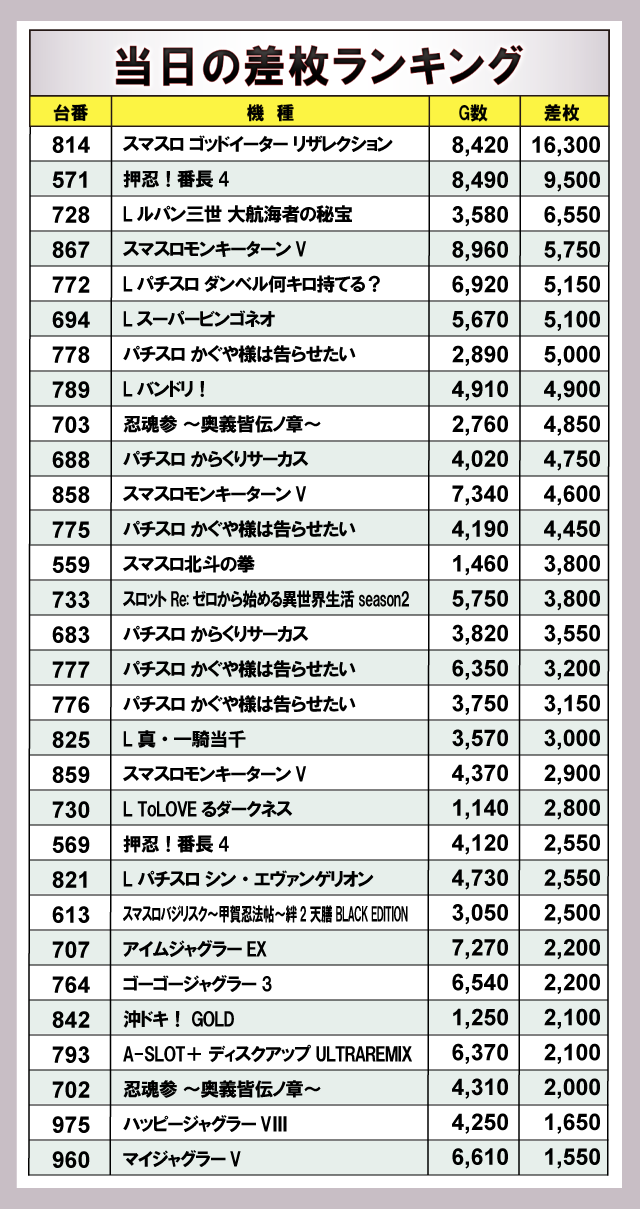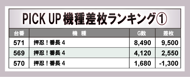 上表の8機種はいずれも大きなマイナスが見られず、ポテンシャルを秘めていた様子が窺える。その中で『忍魂参 ~奥義皆伝ノ章~』、『L南国育ち』は全台プラス差枚数を達成しており、遊技していたファンは自信を持ってレバーを叩いていたことだろう。幅広い機種にチャンスがあったと言っても過言ではなく、同店の高い実力を感じられる内容となっている。