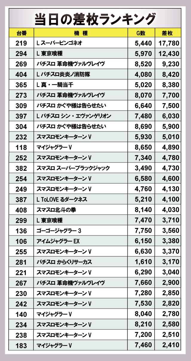 『Lスーパービンゴネオ』『L 東京喰種』から万枚OVERが発生しており、これらは店内の盛り上がりをリードする存在となっていた。そして『パチスロ 革命機ヴァルヴレイヴ』から+9,000枚OVERと続いており、凄まじい熱気が放たれていたのは間違いない。回転数を見ても打ち込まれていた様子が窺えるばかりで、活気と熱気に満ちた1日になったようだ。
