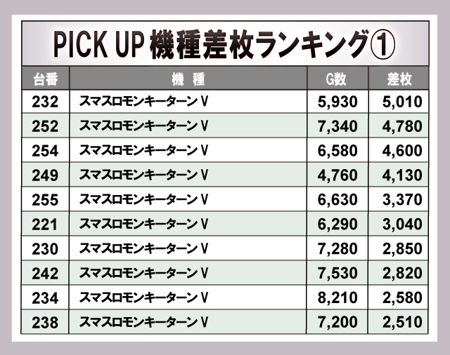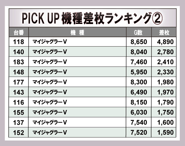 まとまった出玉を獲得し、且つしっかりと打ち込まれている台が複数確認できた『スマスロモンキーターンV』と『マイジャグラーⅤ』は、今回最も大きな盛り上がりを見せていた機種と言えるだろう。そして上表を見ての通り、AT機・ノーマル機の両方にチャンスがあったと窺える!