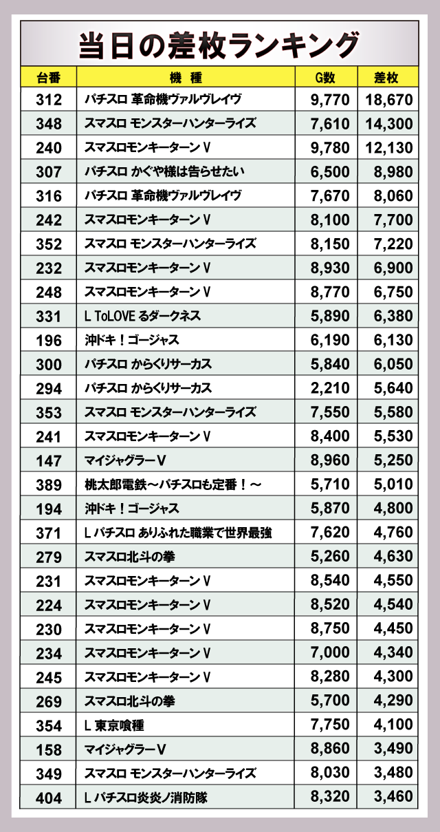 『パチスロ 革命機ヴァルヴレイヴ』から+18,670枚、『スマスロ モンスターハンターライズ』から+14,300枚、『スマスロモンキーターンV』から+12,130枚と合計3台から万枚OVERが生まれており、当日はこの3台が店内の熱気を引き上げていた。それに続いて『パチスロ かぐや様は告らせたい』から+8,980枚をマークし、人気スマスロの実力を存分に発揮していた。