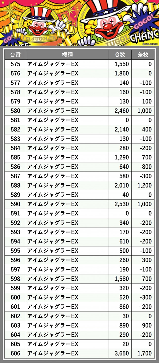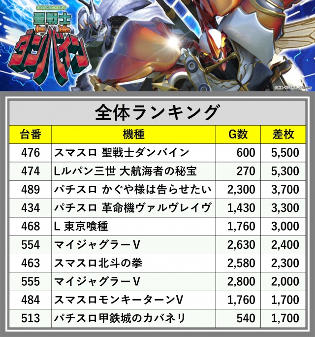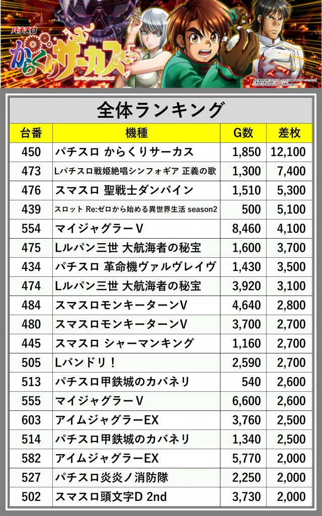 ※差枚数順に掲載しています