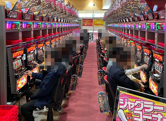「アイムジャグラーEX」も人気があり、シマ内はにぎやかな状況。