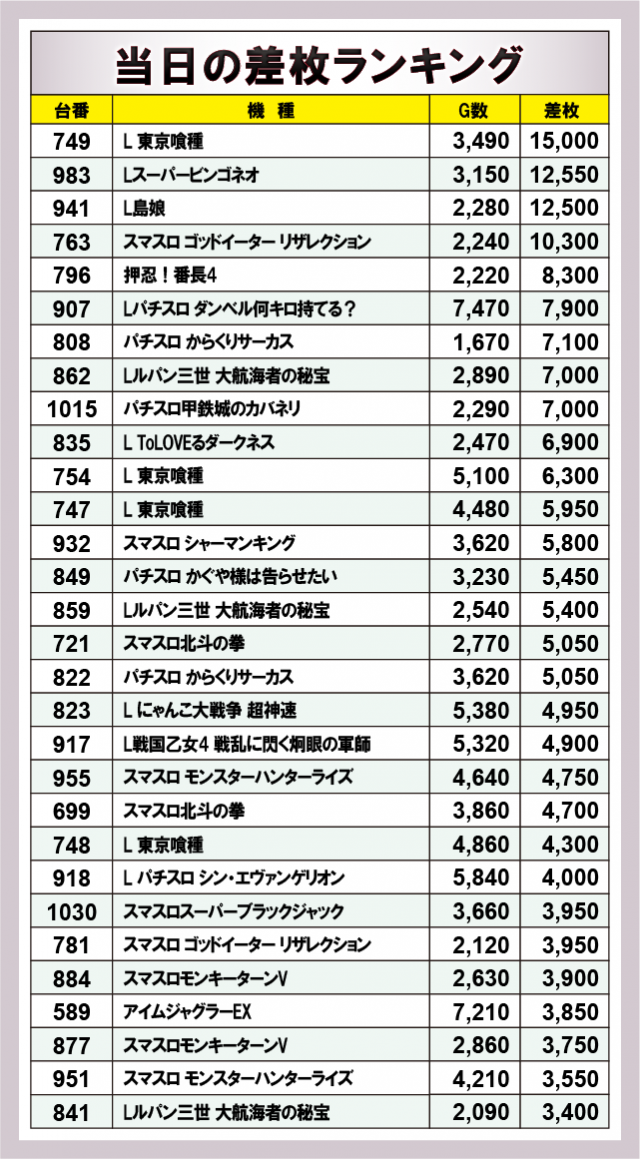 『L 東京喰種』『Lスーパービンゴネオ』『L島娘』『スマスロ ゴッドイーター リザレクション』から計4台の万枚OVERが発生し、店内の盛り上がりをリードしていた。ランキング30台は3,000枚OVERからとなっているが、『パチスロ甲鉄城のカバネリ』『アイムジャグラーEX』といったメダル機もランクインしており、ファンは各所で右肩上がりに伸びる出玉に恍惚の表情を浮かべていたことだろう。