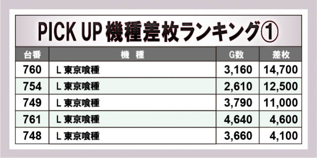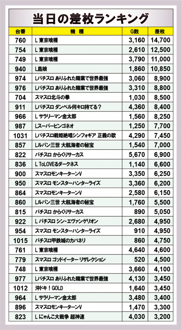 『L 東京喰種』から3台の万枚OVERが発生し、この日の上位を独占!さらに『L島娘』からも万枚OVERが生まれ、その後ろには『Lパチスロ ありふれた職業で世界最強』『スマスロ北斗の拳』『Lパチスロ ダンベル何キロ持てる?』など、最新台から定番人気機種までスマスロ機を中心に様々な機種から大台突破台が数多く見られるのも鮮烈だ。