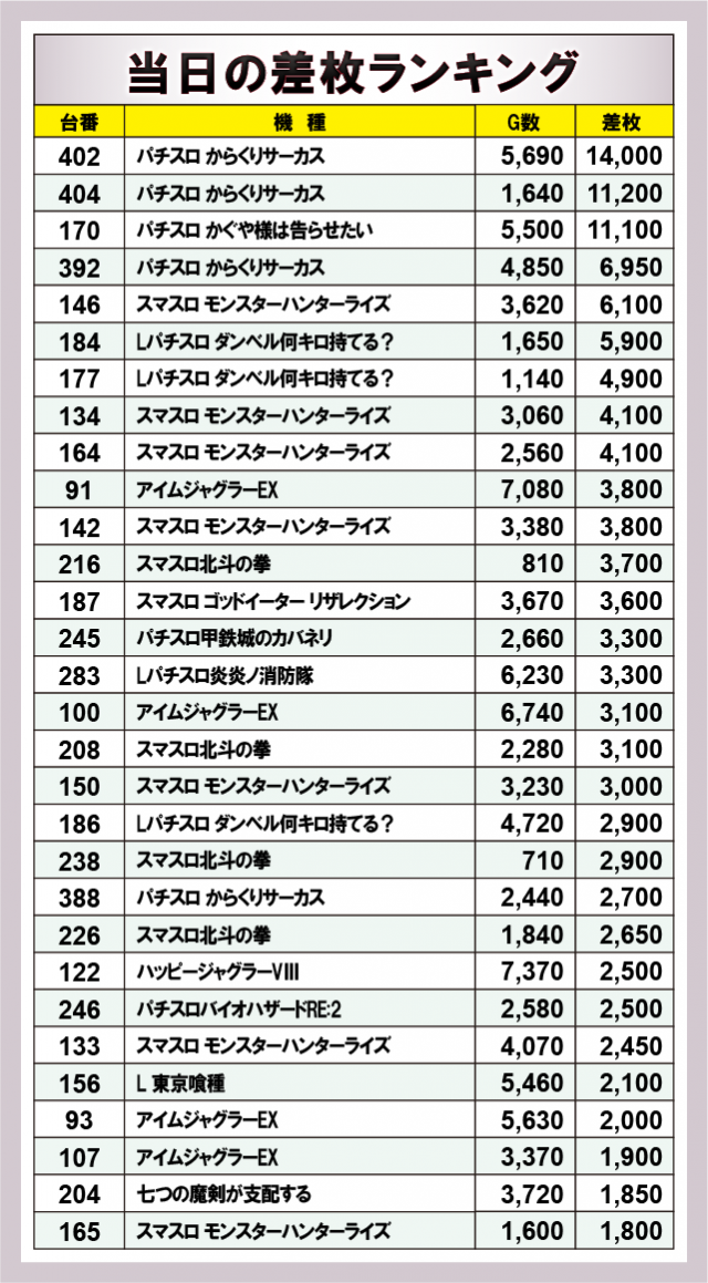 ※差枚数順に掲載しています。