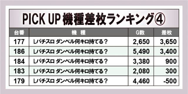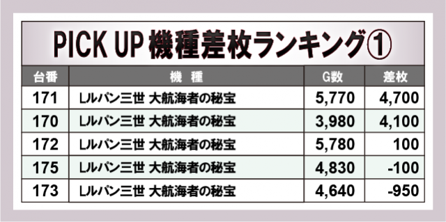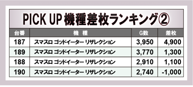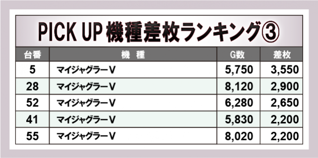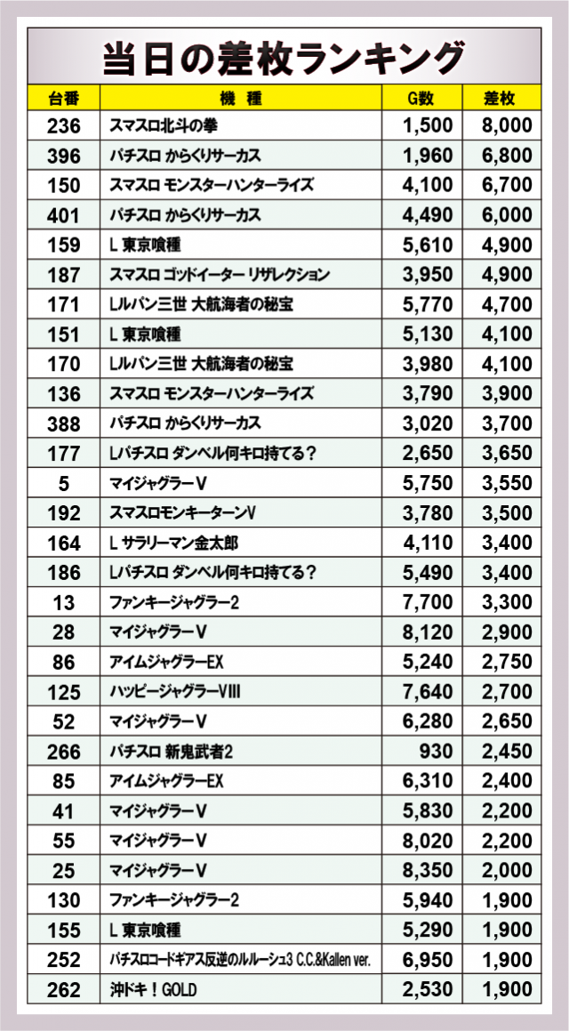 上表の4機種から4桁プラス台が複数発生し、ファンが自信をもってレバーを叩いていた様子が目に浮かぶ。また、AT機のみならずノーマル機の『マイジャグラーⅤ』から多数の優秀台がうまれており、スペック問わずに活躍していたことから、同店の力強さが窺える内容となっていた。