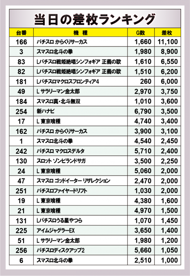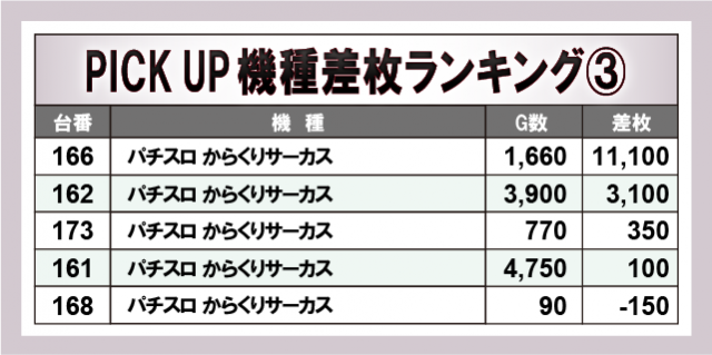 『パチスロからくりサーカス』から万枚OVERが発生!さらに『スマスロ北斗の拳』で8,000枚OVER、『Lパチスロ戦姫絶唱シンフォギア 正義の歌』『Lパチスロマクロスフロンティア4』で6,000枚OVERをマークするなど、スマスロ機の活躍が目立っていた。一方で、メダル機も奮闘していた様子が窺え、ホール中で大いに盛り上がりを見せていたようだ。