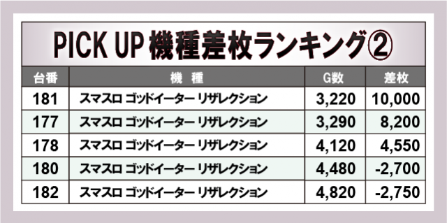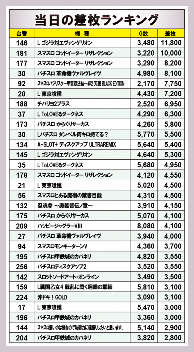 『L ゴジラ対エヴァンゲリオン』『スマスロ ゴッドイーター リザレクション』から万枚OVERが発生し、店内の盛り上がりをリードする存在となった。その他ランキングを見渡してみると、スマスロ機を筆頭にメダル機まで多くの優秀台が確認でき、特定の機種というよりは各機種に満遍なくチャンスがあったことが窺える内容となった!