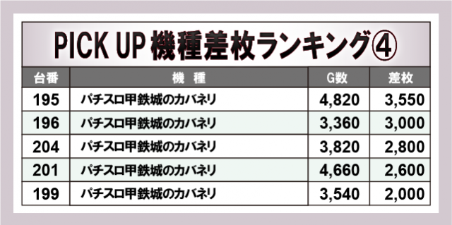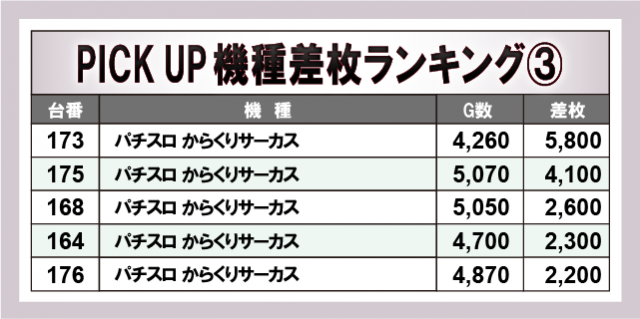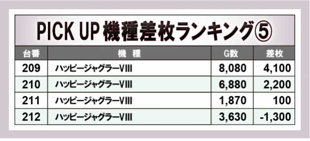 店内では注目すべき機種が多数見受けられた。特に上表の5機種は打ちごたえのある状況が整っていたことから、館内の盛り上がりに大きく貢献していたと言えるだろう。いずれも、差枚数プラス4桁を多数輩出しており、多くの台が可能性を秘めていたはずだ。