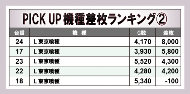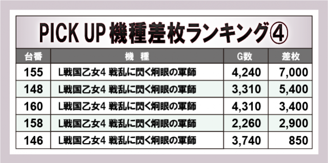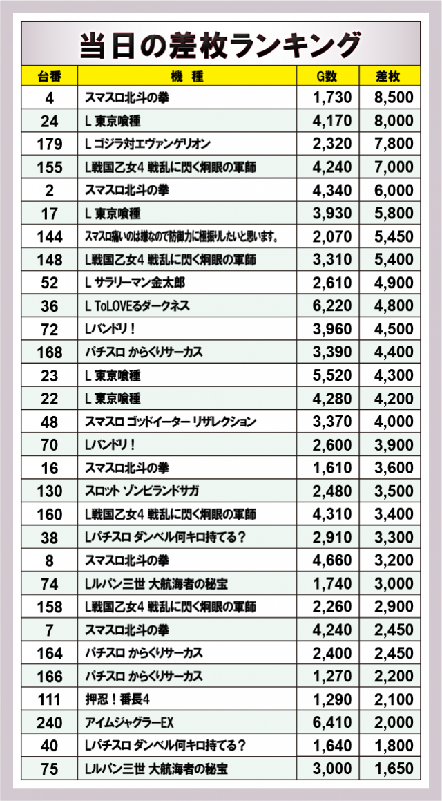 上記で取り上げた『スマスロ北斗の拳』『L 東京喰種』『L戦国乙女4 戦乱に閃く炯眼の軍師』は他にも2,000枚OVERが複数うまれ、遊技するファンは好感触に笑みを浮かべていたことだろう。さらに、『Lバンドリ!』『アイムジャグラーEX』からも打ち込まれた様子が窺え、ファンは打ちごたえのある状況に歓喜していたはずだ。