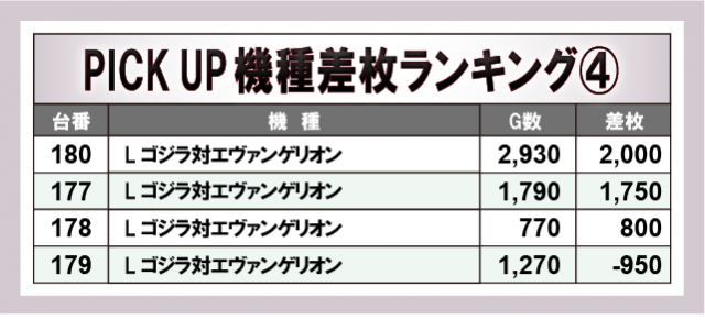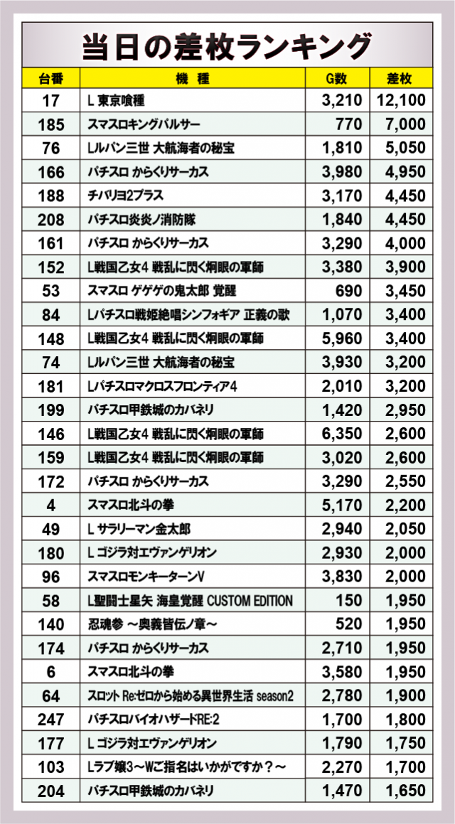 上表の機種は店内を盛り上げる存在となり、まとまった出玉を獲得していたのが目に焼きつくばかりだ。その中で『L 東京喰種』で万枚OVERが発生し、店内の盛り上がりをリードする存在となっていた。さらに『スマスロキングパルサー』から7,000枚OVER、『Lルパン三世 大航海者の秘宝』から5,000枚OVERがうまれ、大きな熱気に包まれていたのは確かだ。他にもまとまった出玉を獲得する台が多く、遊技するファンは相当な手応えを掴んでいたことだろう。