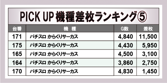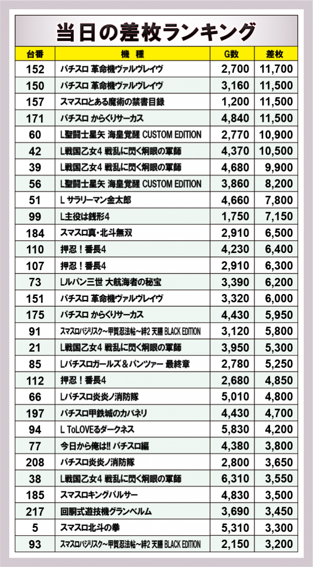 上表の通り、トップ30台は3,000枚OVERからとなっており、2台の『パチスロ 革命機ヴァルヴレイヴ』を筆頭に『スマスロとある魔術の禁書目録』『パチスロからくりサーカス』『L聖闘士星矢 海皇覚醒 CUSTOM EDITION』『L戦国乙女4 戦乱に閃く炯眼の軍師』から計6台の万枚OVERが発生し、館内は熱気が包み込んでいたと言えよう。 他にもまとまった出玉を獲得する台が多く、遊技するファンは相当な手応えを掴んでいたことだろう。