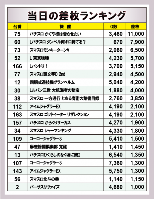 ※差枚数順に掲載しています。