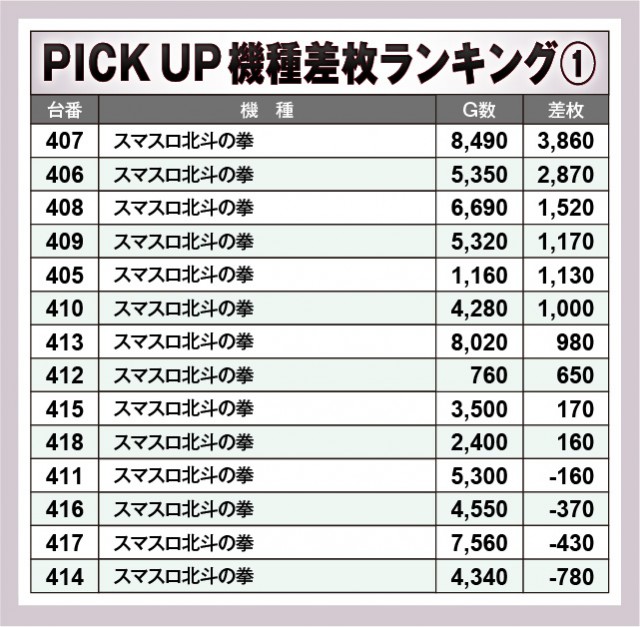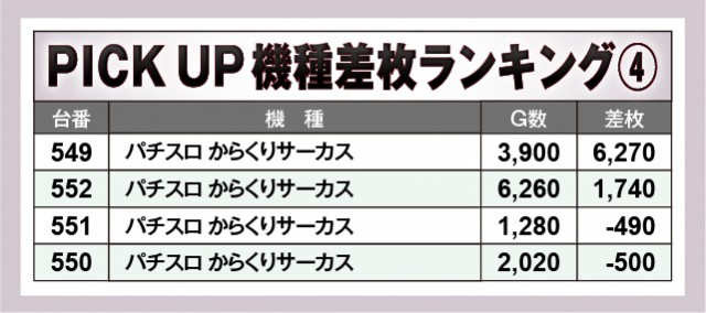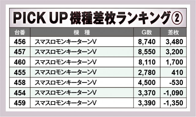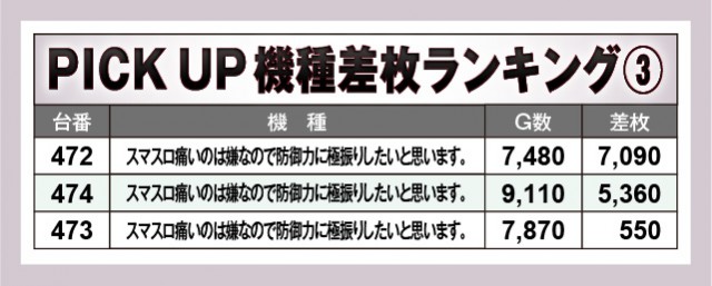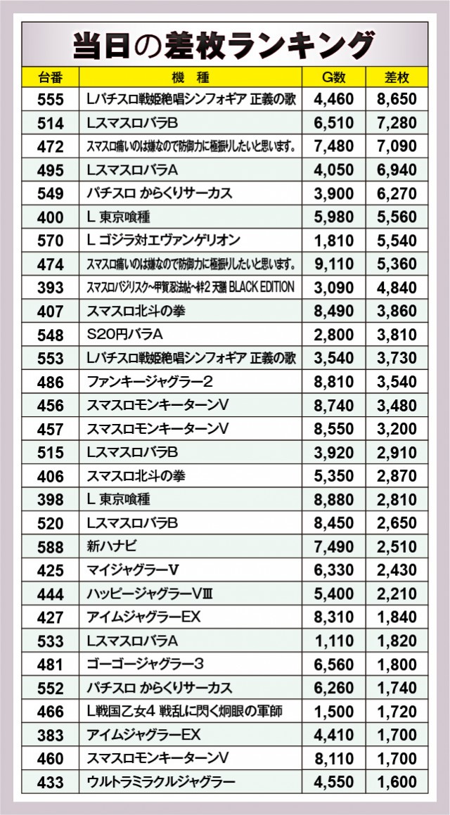 『スマスロ痛いのは嫌なので防御力に極振りしたいと思います。』は全台プラス差枚数を達成しており、そのポテンシャルを存分に発揮してくれた。『スマスロ北斗の拳』『スマスロモンキーターンV』『パチスロ からくりサーカス』も同様に大きなマイナスが見られず、高い回転数も確認できることから、相当な手応えを感じられる状況だったようだ。人気機種の活躍も相まって、レバーオンに自然と力が入っていたことだろう。