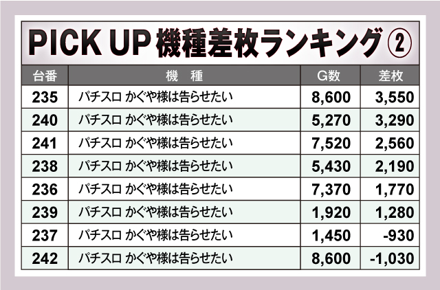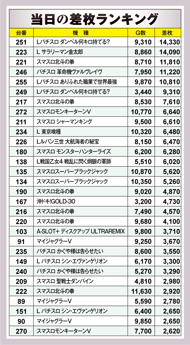 まずは当日の差枚ランキングを紹介していこう。30台すべてが差枚+2,000枚オーバーで、+3,000枚オーバーは24台出現。さらに大台突破の+10,000枚オーバーは5台出現と大盛り上がり! それらのなかでもっとも優秀だった台は、251番台の「Lパチスロ ダンベル何キロ持てる?」で、差枚は+14,330枚を獲得! また、その他ランクイン機種を見渡すと、人気の「スマスロ北斗の拳」をはじめ、「Lパチスロ ありふれた職業で世界最強」や「L 東京喰種」などの最新台が多数ランクイン。ファンからの注目度が高い機種を中心にチカラを入れていたようだ!