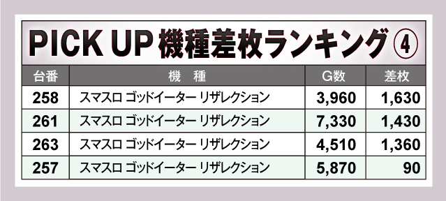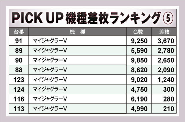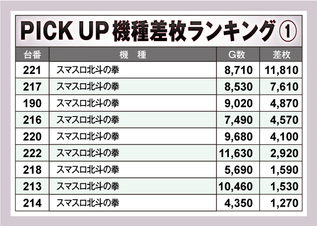 続いては、当日店内を大いに盛り上げた5機種をチェック。5機種全てから良台が出現していたが、とくに注目して欲しいのは「スマスロ北斗の拳」で間違いないだろう。ピックアップした9台すべてが+1,000枚オーバーのプラスで終了しており、そのうち2台が差枚+7,000枚超えと上々の結果をマーク! その他の機種も素晴らしく、これら5機種以外からも良台は店内の各所に出現していた!