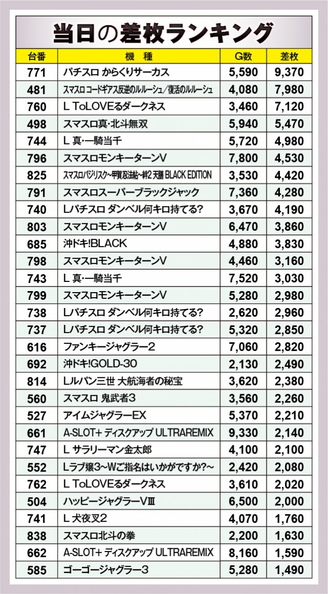 『パチスロ からくりサーカス』にて9,000枚OVERという大きな熱気が放たれると、『スマスロ コードギアス反逆のルルーシュ/復活のルルーシュ』『L ToLOVEるダークネス』にて7,000枚OVERと大台突破を確認できる。館内に設置された幅広い機種が活躍しているのが上表から見て取れるばかりで、ファンはお気に入りの機種を打ち込んでは、心から遊技を楽しんでいたことだろう。