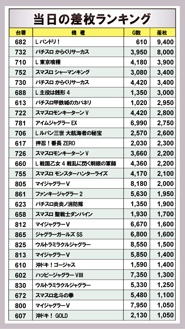 ※差枚数順に掲載しています。