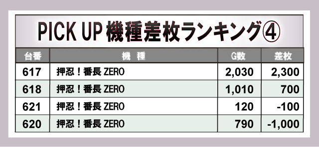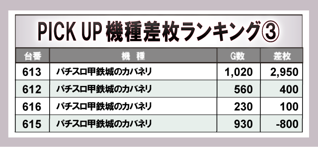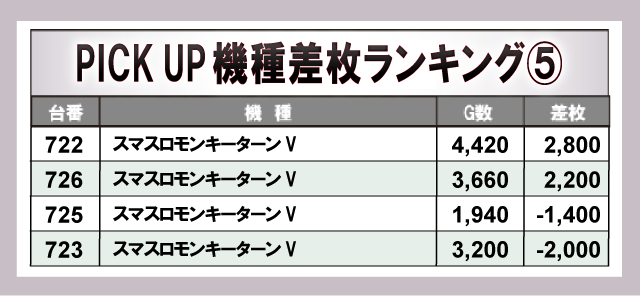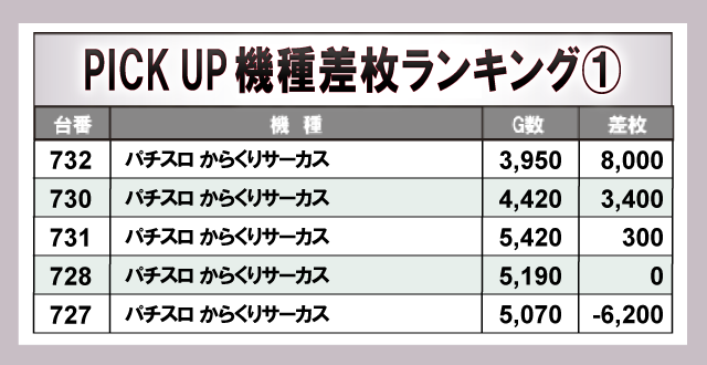 『Lバンドリ!』から+9,400枚と万枚に届く勢いを見せていた。それに続き『パチスロ からくりサーカス』から+8,000枚をマークし、店内の盛り上がりに大きく貢献していた。また、AT機だけでなく『ジャグラー』シリーズといったノーマル機も多数ランクインしており、各所で打ちごたえのある状況が整っていたことが窺える。