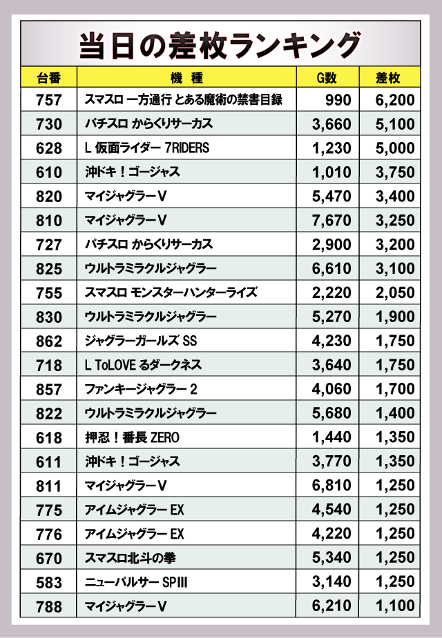 『スマスロ 一方通行 とある魔術の禁書目録』から+6,000枚OVER、『パチスロ からくりサーカス』『L 仮面ライダー 7RIDERS』では+5,000枚OVERが生まれており、当日はこの3台が店内の熱気を引き上げていた。他にもまとまった出玉を確保する台を確認でき、遊技していたファンはコンスタントなボーナス当選に笑みが溢れていたことだろう。