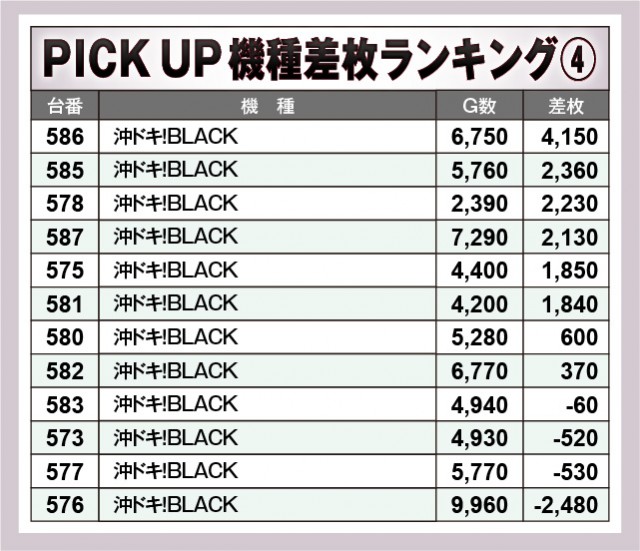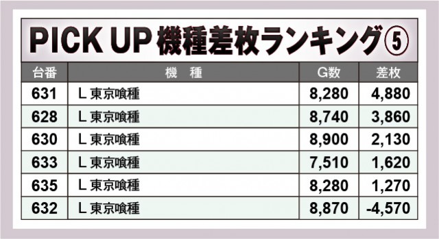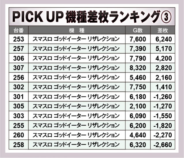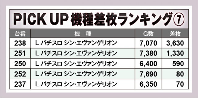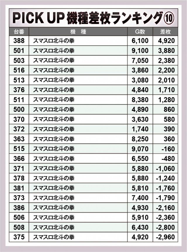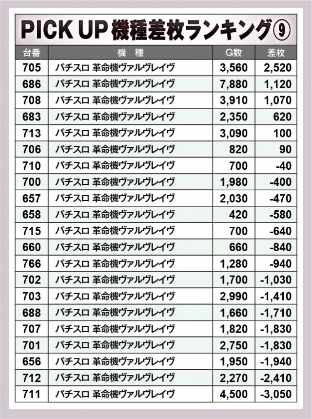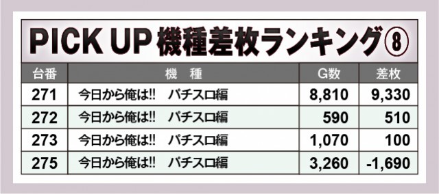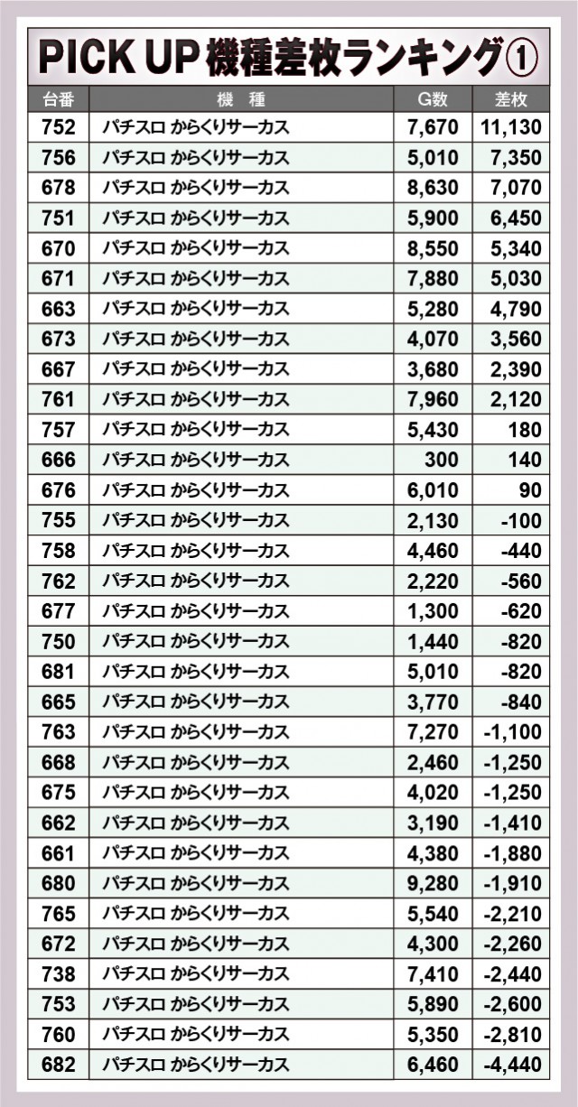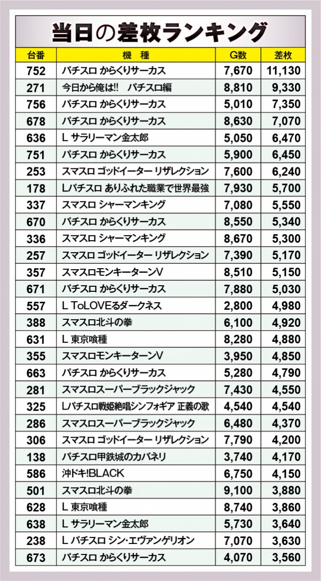 上表は3,000枚OVERから名を連ねており、いかに店内が大きな熱気に包まれていたのかが分かる。その中で『パチスロ からくりサーカス』から万枚OVERが飛び出し、さらに同機種は6~7,000枚OVERと大台突破台が多発。『今日から俺は!! パチスロ編』も9,000枚OVERと奮起しており、まとまりのある出玉を持つファンが多かったことから、彼らの満足度の高さが窺えるばかりだ。