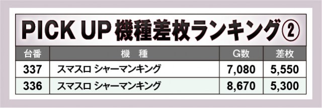 『スマスロ シャーマンキング』『L 東京喰種』と新台がさっそく活躍しており、前者は全台プラス差枚数をマーク。ニューフェイスの存在感の大きさに負けじと『パチスロ からくりサーカス』や『スマスロ ゴッドイーター リザレクション』、『スマスロ北斗の拳』らも気を吐いており、優秀機種が一丸となって活気と熱気を形成していた。打ちごたえのある状況だったのは間違いなく、ファンは満足度の高い1日を過ごせたことだろう。