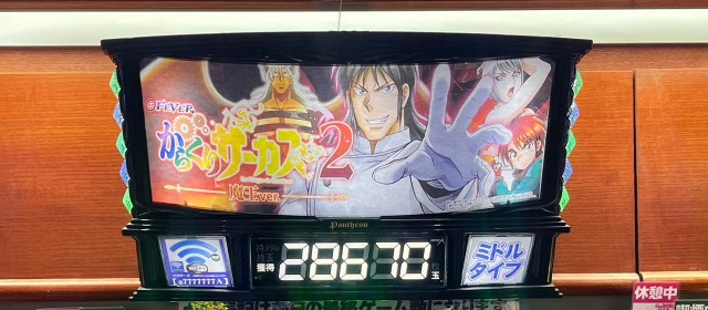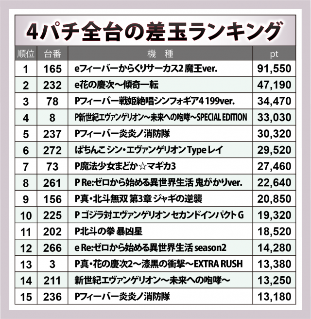 3度連続で15台がオール5桁のプラスを達成し、+20,000個以上は9台、+30,000個オーバーは5台、+40,000個オーバーは2台、そして『eフィーバーからくりサーカス2 魔王ver.』165番台が+91,600個弱の超絶出玉で頂点に上り詰めた。