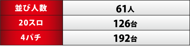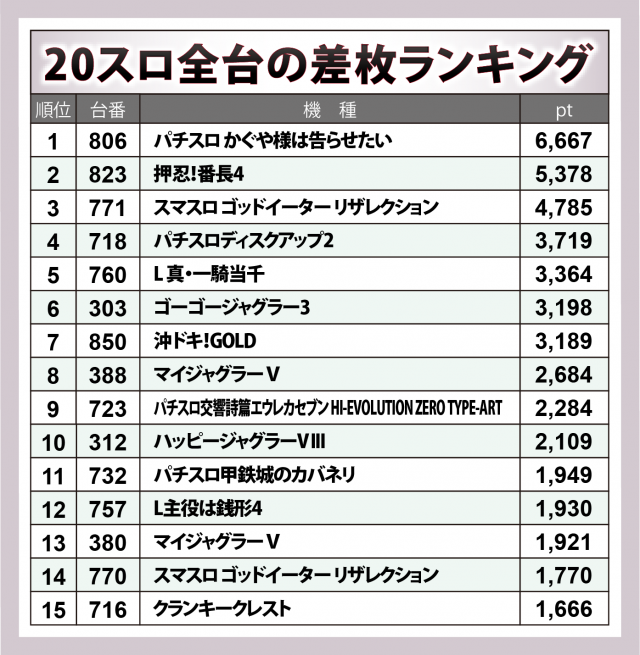 15台の全てが4桁プラスを成立し、+2,000枚以上は10台、+3,000枚以上は7台、+4,000枚以上は3台、+5,000枚オーバーは2台、+6,000枚オーバーは1台となった。