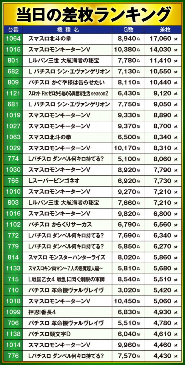 ※差枚数順に掲載しています