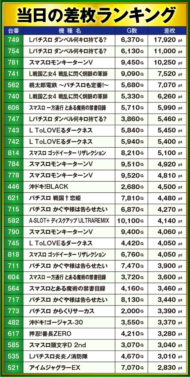 レポートの最後に「Super D’STATIONガーデン前橋店」の差枚ランキングも掲載!