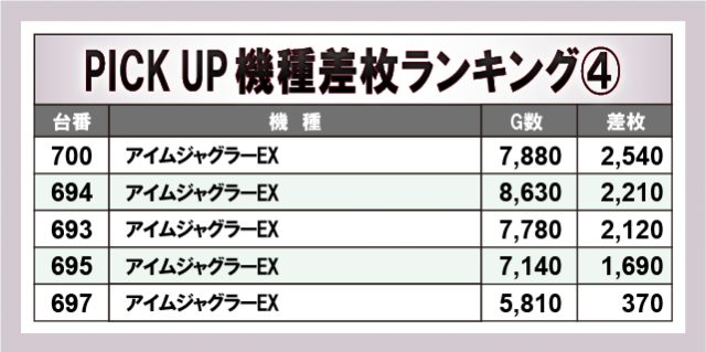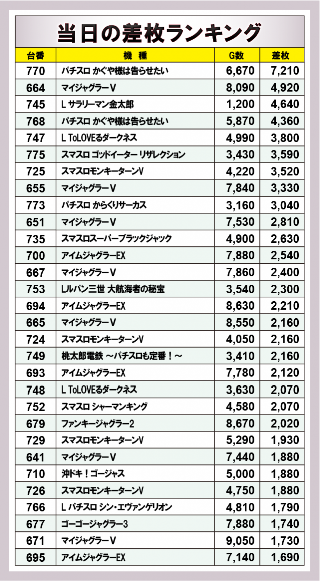 差枚数で大きな数字を打ち立てたのが『パチスロ かぐや様は告らせたい』だ。7,000枚OVERをマークし、店内の熱気を引き上げていた。そして人気スマスロ機はもちろん、『マイジャグラーⅤ』や『アイムジャグラーEX』などのメダル機も活躍を見せており、幅広い機種にチャンスがあったことが窺える。
