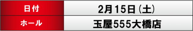 2月15日、『玉屋555大橋店』にて「たまピー来店取材」3日連続×3店舗合同実施の2日目を迎えた。『玉屋409雑餉隈』『玉屋666唐津』とともに好成績を収めた昨日を終え、朝から駆けつけたファンは今か今かと開店の時を待っていたのが印象に残る。果たして今回はどのような1日になったのか…さっそく以下から出玉詳細データとともに、当日の店内の様子に迫っていこう!