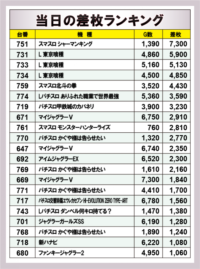 ※差枚数順に掲載しています。