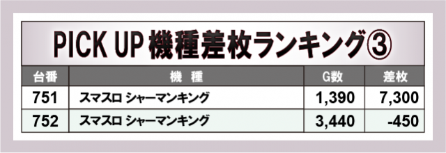 新台『スマスロ シャーマンキング』から7,000枚OVERが生まれ、『L 東京喰種』でも3台が立て続けに追随!その他にもスマスロ人気機種を筆頭に『ジャグラー』シリーズも奮闘しており、各所で打ちごたえのある状況が整っていた様子から、ファンにとって叩き甲斐があっただろう。